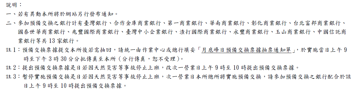 相關附檔 106年月底峰日實施(暫停)預備交換預定時程表下載 月底峰日預備交換票據抽票通知單下載